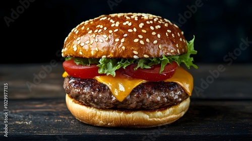 Freshly prepared sesame encrusted burger nestled on a dark rustic wooden surface offering ample copy space for branding menu design or product placement