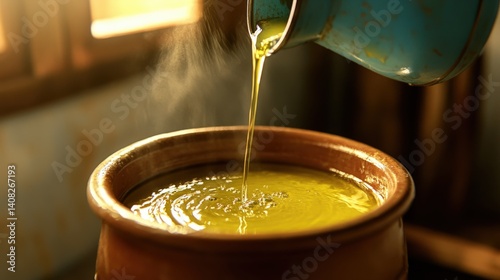 Freshly pressed olive oil pouring into a terracotta container, creating ripples