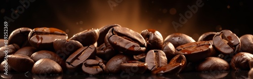Freshly roasted coffee beans close up on a dark background.