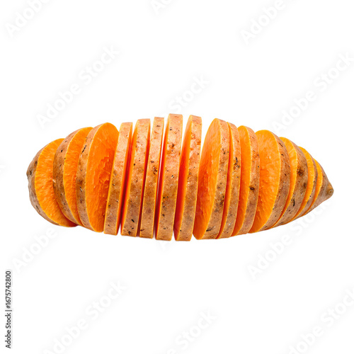 Freshly sliced sweet potato sticks arranged beautifully on a white backdrop vibrant in color and ready for a healthy snack or meal, isolated