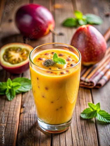 Freshly squeezed passion fruit juice and fresh passion fruit on a wooden table