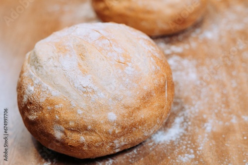 Freshly-baked bread resting on a wooden table top, with a light dusting of flour