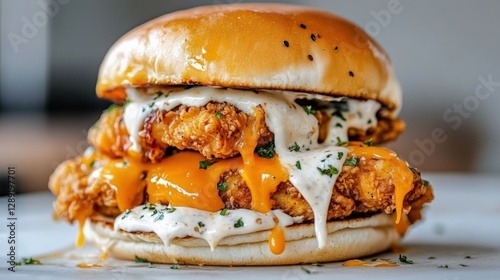 Fried chicken burger with melted cheese, mayo and orange sauce, close up, fast food, copy space