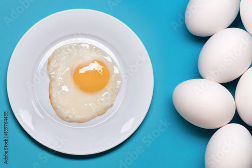 Fried Eggs In A White Plate Near Eggs On A Blue Background
