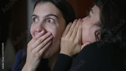 Friend telling secret to woman ear whispering. Young woman shock surprise reaction to gossip news. People sharing secrets