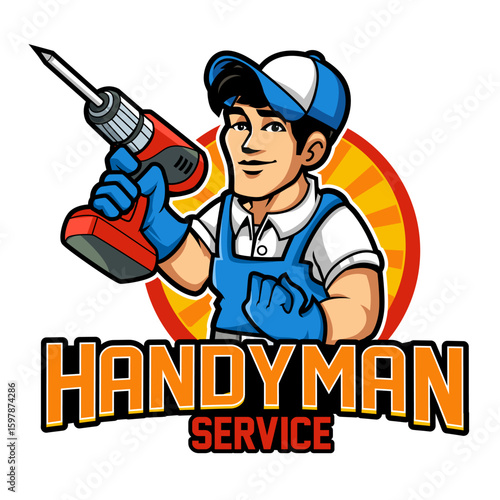 Friendly Handyman Mascot Holding Power Drill, Repair Service Logo