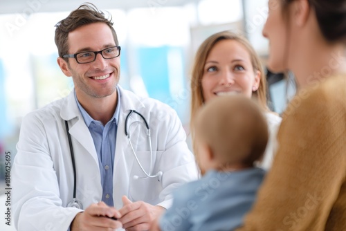 Friendly male pediatrician smiling during a consultation with a mother and her baby. Doctor providing family healthcare in a modern clinic