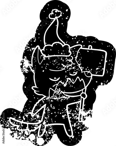 friendly quirky cartoon distressed icon of a fox wearing santa hat