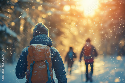 friends hiking in the winter snowy forest, with a blurred background, sunlight filtering through the trees, and a bokeh effect. The image shows the backs of the hikers