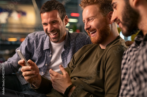 Friends laughing and using smartphone at pub