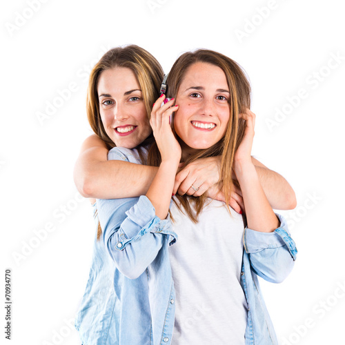 Friends listening music over white background