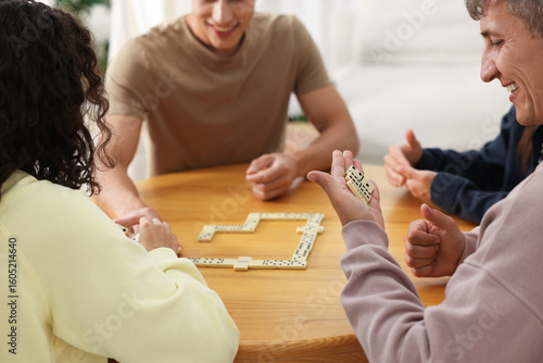 Friends playing dominoes at wooden table indoors, closeup