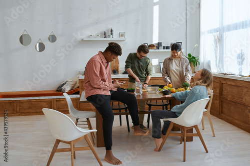 Friends vegetarian dinner home in the kitchen