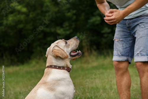Friendship of man and dog. Happy young man is playing with his friend - dog Labrador