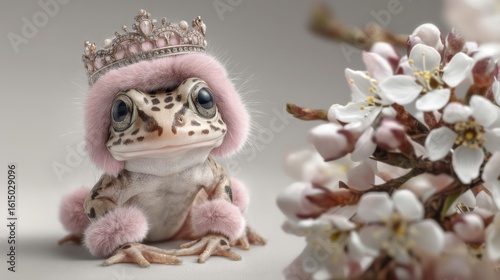 Frog in Pink Fur and Crown. Fantasy frog in pink faux fur cuffs and ornate royal crown, styled in high-fashion surreal aesthetics with detailed textures and soft lighting.
