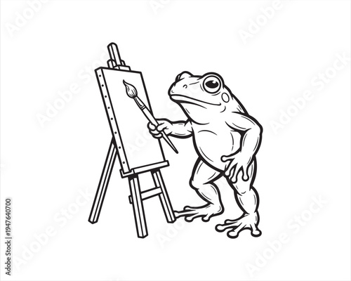 Frog Painting on Easel Line Art Illustration – Cartoon Artist Frog Character