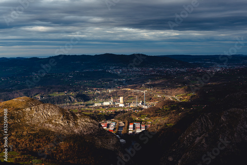 From above factory in valley against city at foothill of mountains at horizon under gray cloudy sky in Monsacro