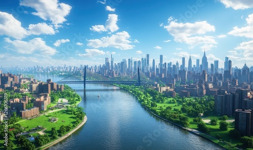 From above, one can see a modern city skyline, an impressive cable-stayed bridge, a winding river, an urban landscape, lush green parks