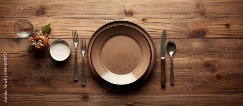 From an aerial perspective a wooden table is adorned with an empty plate and silverware set creating a visually appealing composition with ample room for additional content copy space image