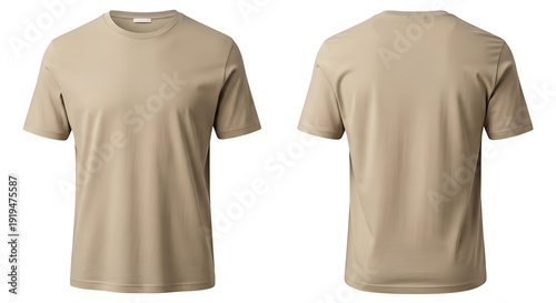 Front and back view of a plain beige t-shirt on white background khaki clothing