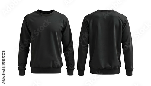 Front and back views of a plain, dark-colored sweatshirt on a black background