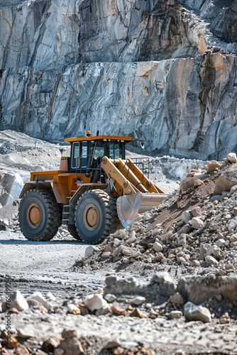 Front end loader working at a quarry processing plant stockpile