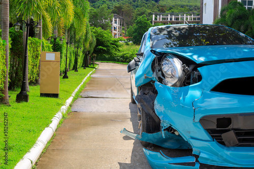 Front of blue color car big damaged and broken by accident on city street parking can not drive any more. With copy space for text or design
