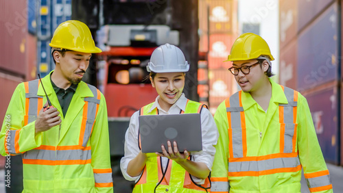 Front of group professional dock worker and engineering people walking and taking with their supervisor while record data online with digital connection tablet, background of crane and layer of tank