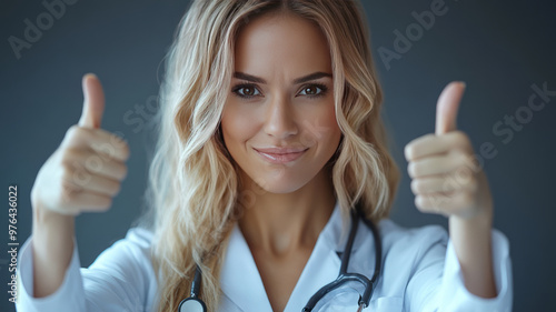 front shot of a beautiful female doctor doing a thumbs up and a thumbs down, smiling,