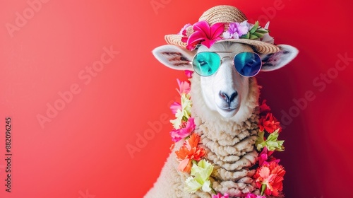 Front side close up of Happy smile sheep with a floral lei, sun glass, summer hat placed on a solid pastel red background with space above for text