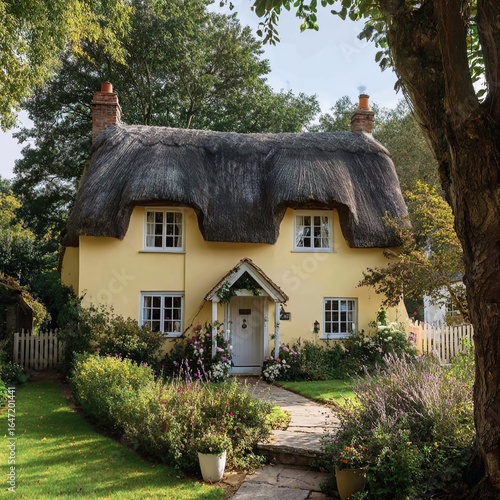 front view of a cozy English cottage in daylight, with pastel yellow walls