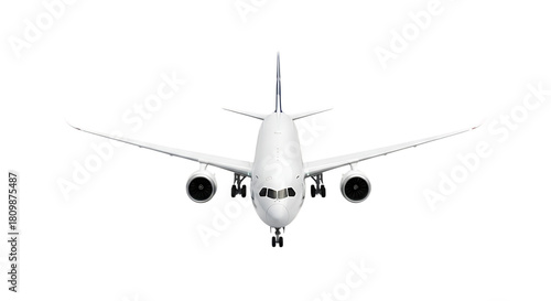 Front view of a modern white commercial passenger airplane with landing gear extended, isolated on a clean white background.