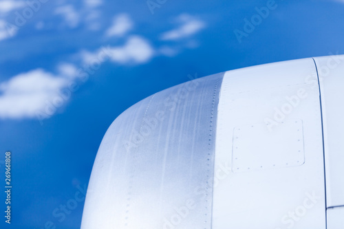 Front wing airplane view lying floating condensation clouds sky background
