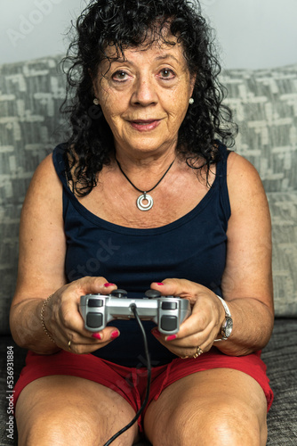 Frontal image of a retired woman sitting on the sofa holding the video console controller to play an online game.