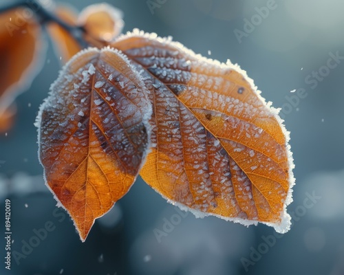 Frost-covered leaves in the winter. AI.