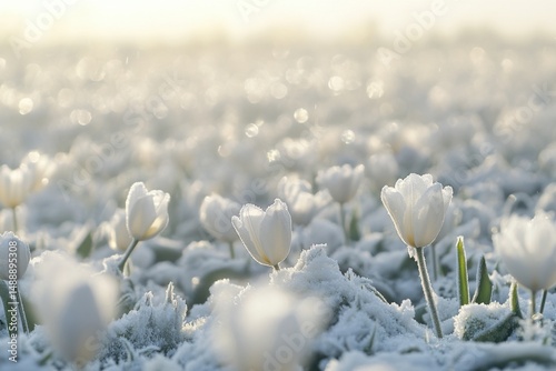 Frost-covered white tulips bloom in a tranquil winter landscape during early morning light