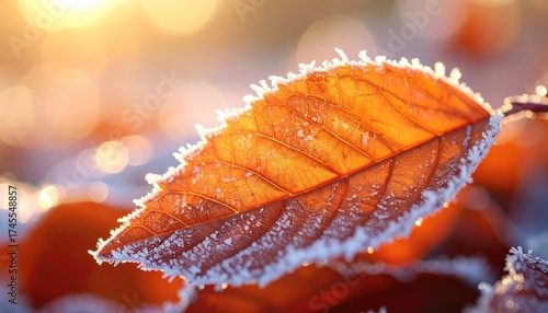 Frosted Orange Autumn Leaf Glittering in Sunlight with Bokeh Background Macro View