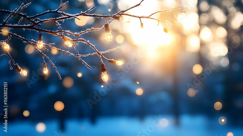 Frosty branch with glowing lights in snowy winter forest at sunset.