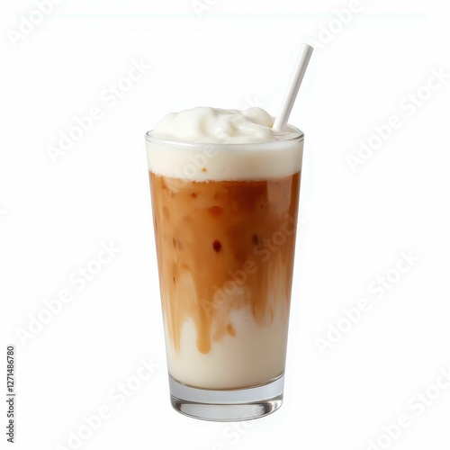 Frothy Iced Coffee in Tall Glass with Straw Refreshing Cold Beverage Creamy Drink on White Backdrop