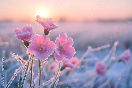 Frozen Beauty: Delicate pink flowers, covered in a fine layer of frost, bask in the soft glow of sunrise, showcasing the resilience and beauty of nature in winter.