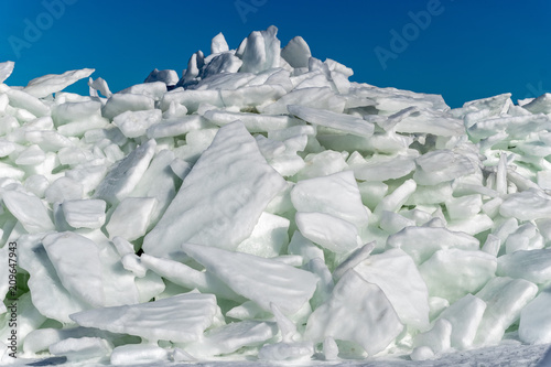 frozen lake covered with stack of ice floes and blue sky