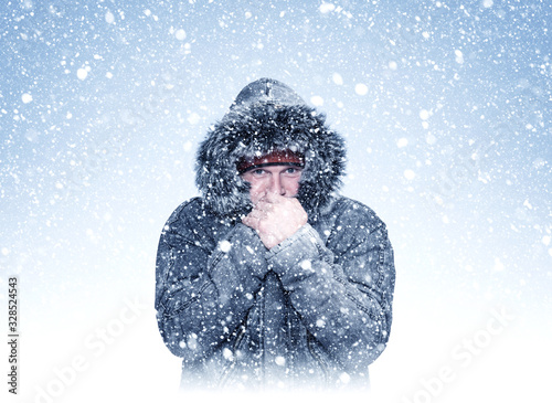 Frozen man in winter clothes warms his hands, cold, snow, frost, blizzard