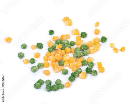 Frozen organic peas and corn isolated on white background