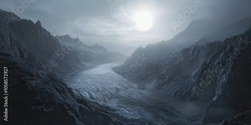 Frozen Valley in a Misty Mountain Landscape