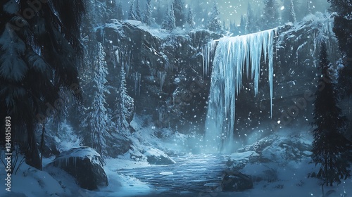 Frozen Waterfall Winter Forest Scene Snow Falling