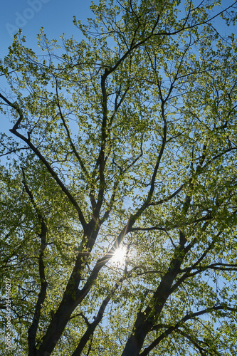 Frühlingsgrün, Sonnenstrählen und blauer Himmel