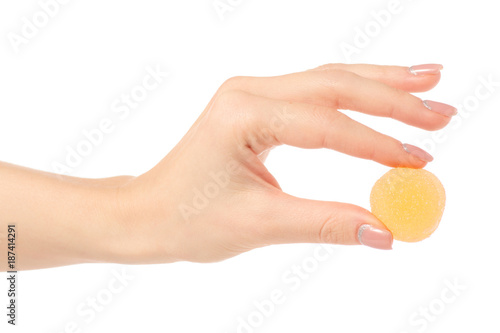 Fruit jelly in sugar in hand