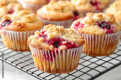 Fruit Muffins, Golden-brown Crumbly Tops, Red Berry Filling Peeking Through, White Paper Liners, On Wire Cooling Rack, Dessert Food Photography, Dessert Menu Style Photo Image