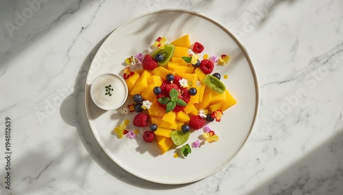 Fruit salad with colorful assortment of fresh fruits, juicy textures and vibrant natural sweetness, clean refreshing presentation for healthy dessert and snack visuals
