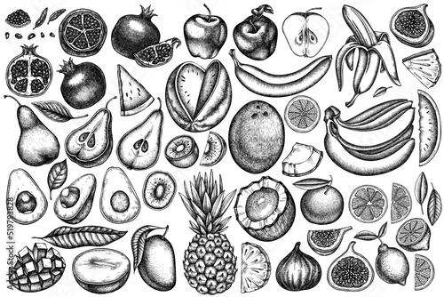 Fruits vintage vector illustrations collection. Black and white bananas, pears, kiwi etc.